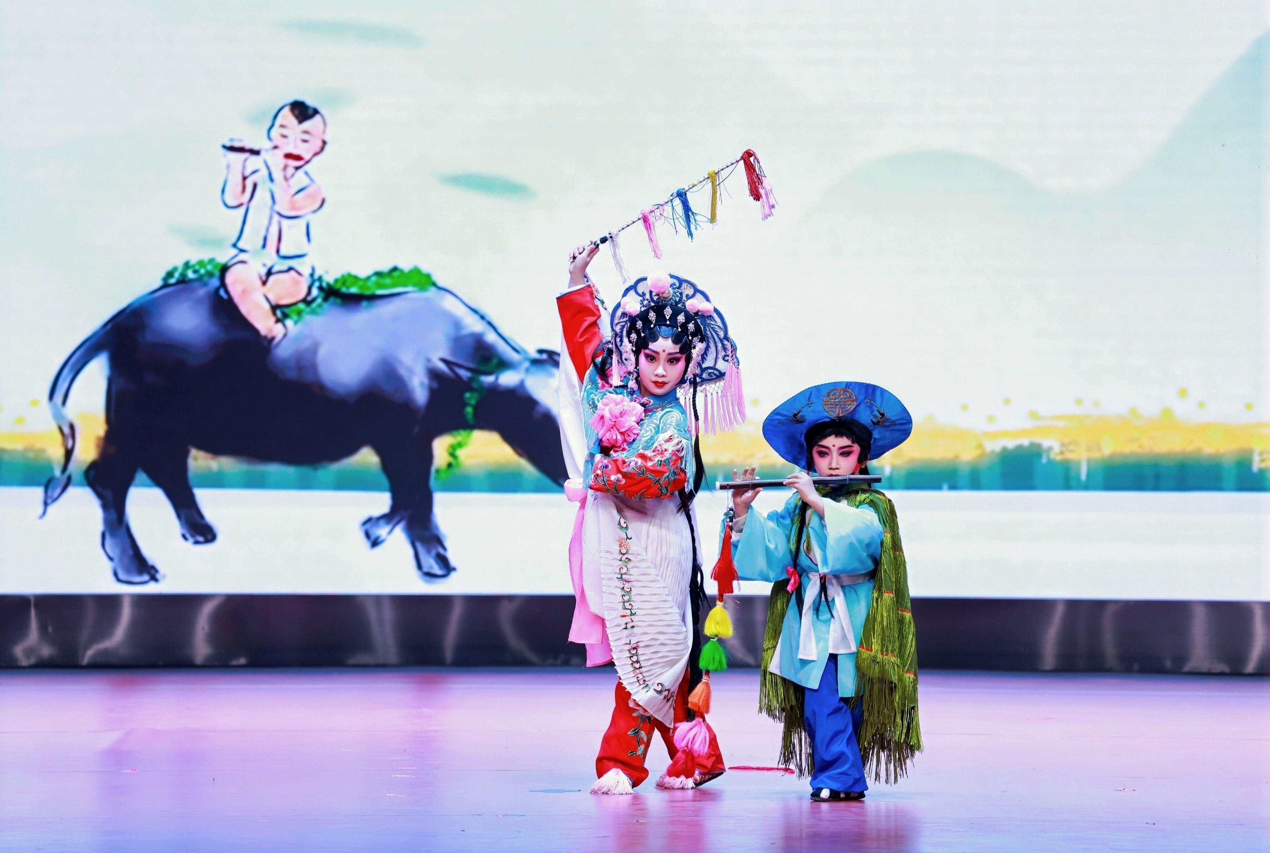舞台上,来自粤港澳大湾区的小演员们神采奕奕,接连奉献了《荔枝颂》《小放牛》《赠梅》等多个经典粤剧粤曲选段。童声清越,唱腔初具韵味;身段虽然稚嫩,却已透出认真与专注。