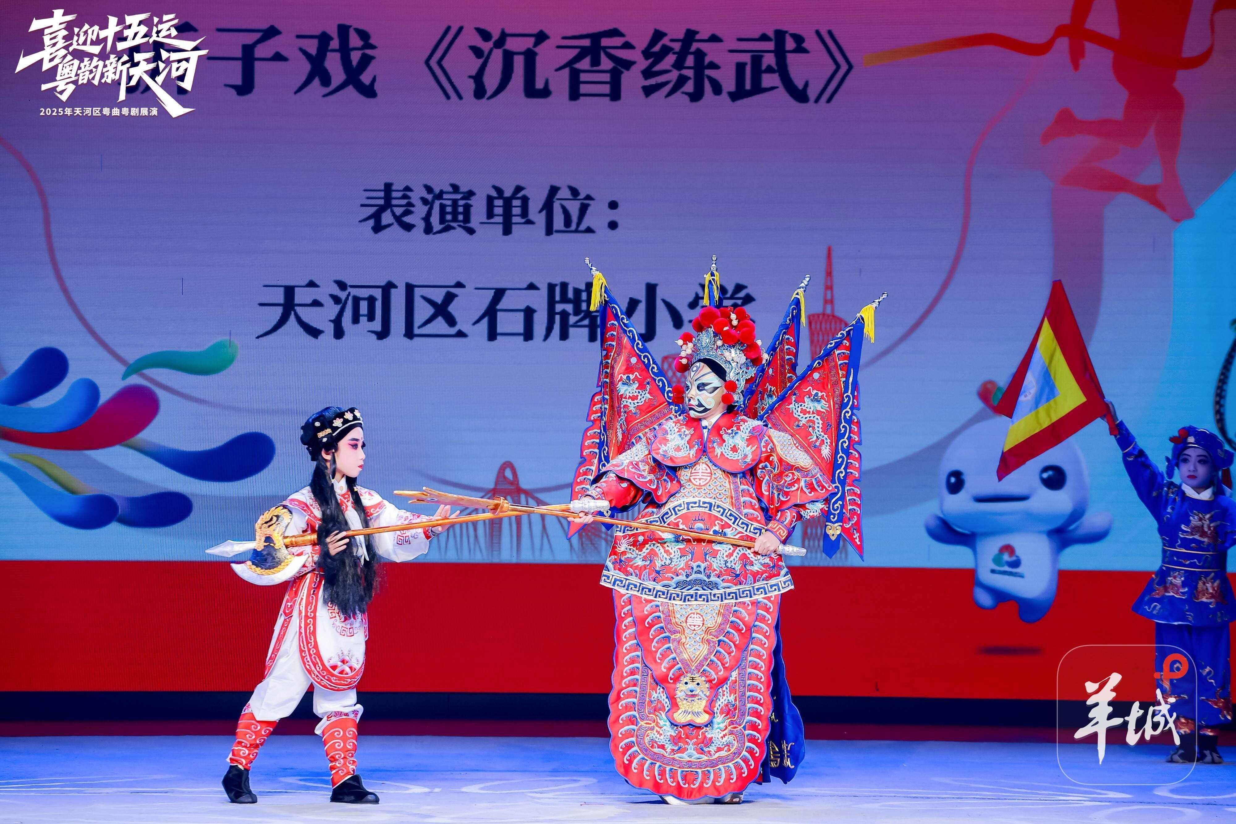 其中,由冼村街道粤剧班演绎的原创佳作《璀璨花城夜》,用粤曲声腔描绘广州夜色,让“花城”风情与传统韵律完美融合。华南农业大学艺术学院演绎的广东音乐《双声恨》,以细腻婉转的曲调诠释“以乐传情”的岭南音乐特质。天河区石牌小学的小演员们演绎折子戏《沉香练武》,翻飞的棍棒、扎实的“唱念做打”,将少年沉香的孝勇与坚毅展现得淋漓尽致。
