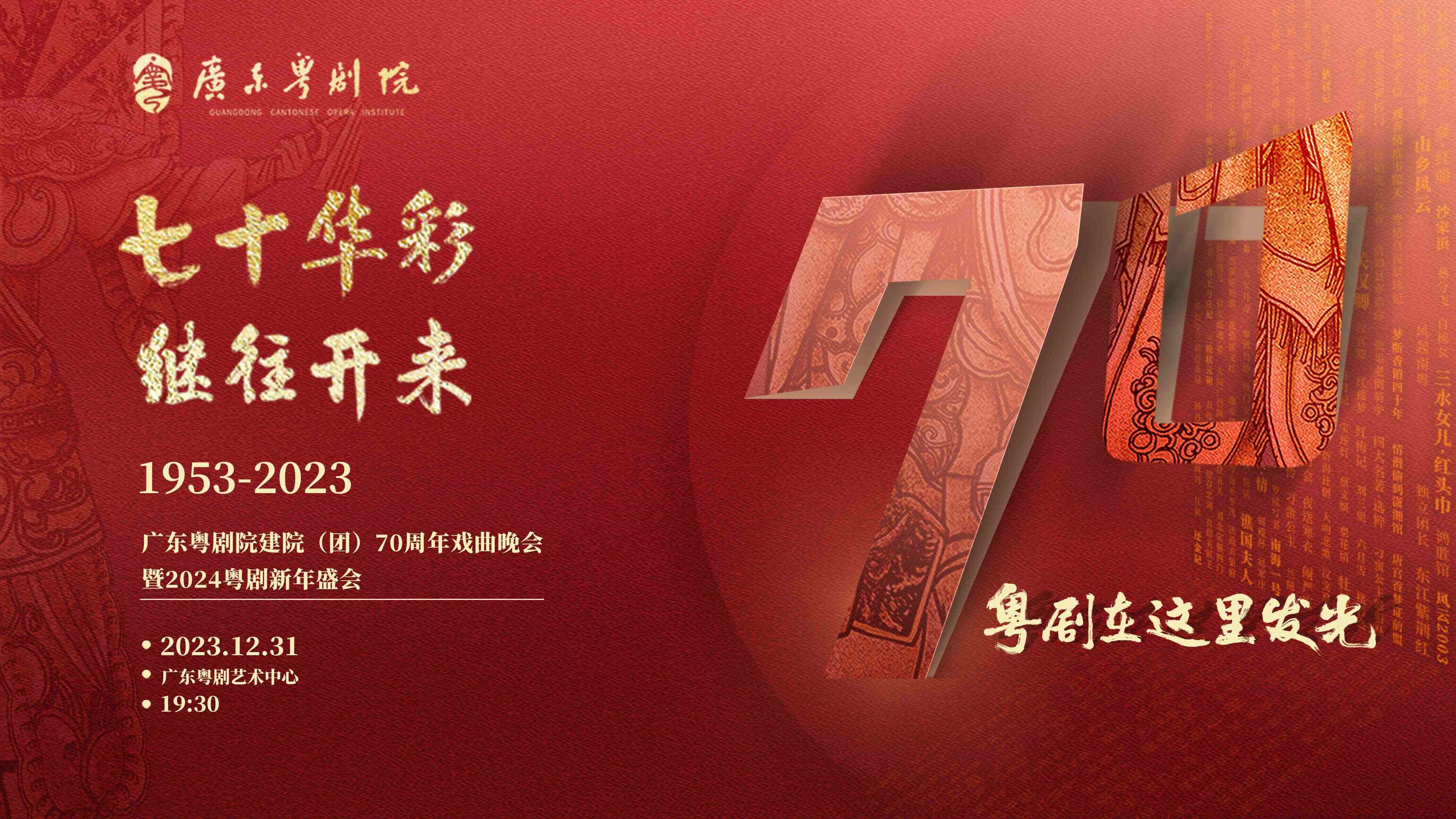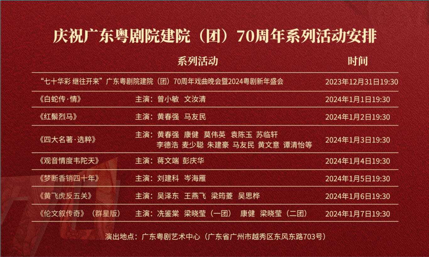 2023年12月31日,《七十华彩继往开来——广东粤剧院建院(团)70周年戏曲晚会暨2024粤剧新年盛会》将作为广东粤剧院建院(团)70周年系列活动开篇,在广东粤剧艺术中心拉开序幕。