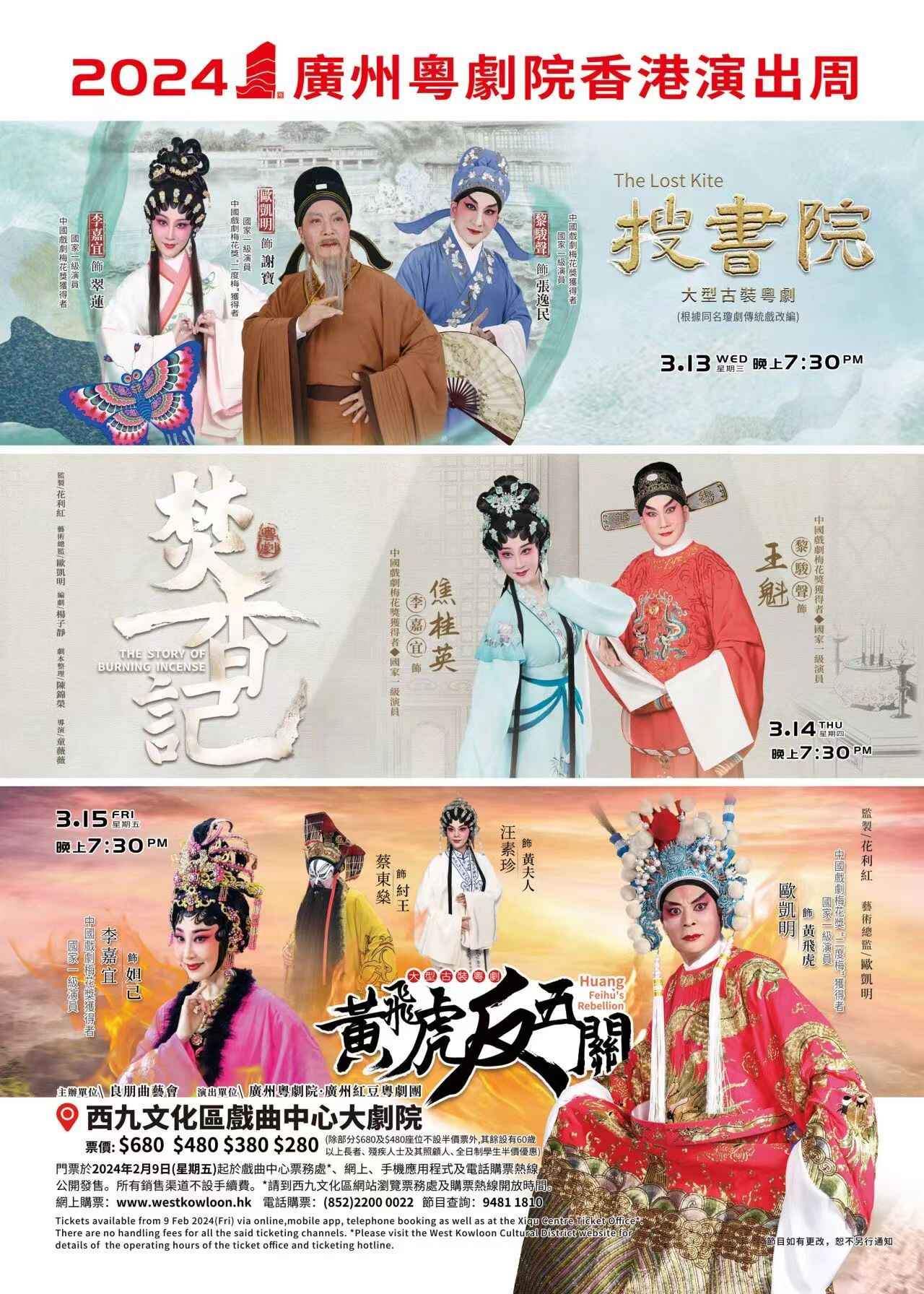 3月13-15日,广州粤剧院将赴香港西九文化区戏曲中心举办“广州粤剧院香港演出周”,分别演出三部古装大戏《搜书院》《焚香记》《黄飞虎反五关》。