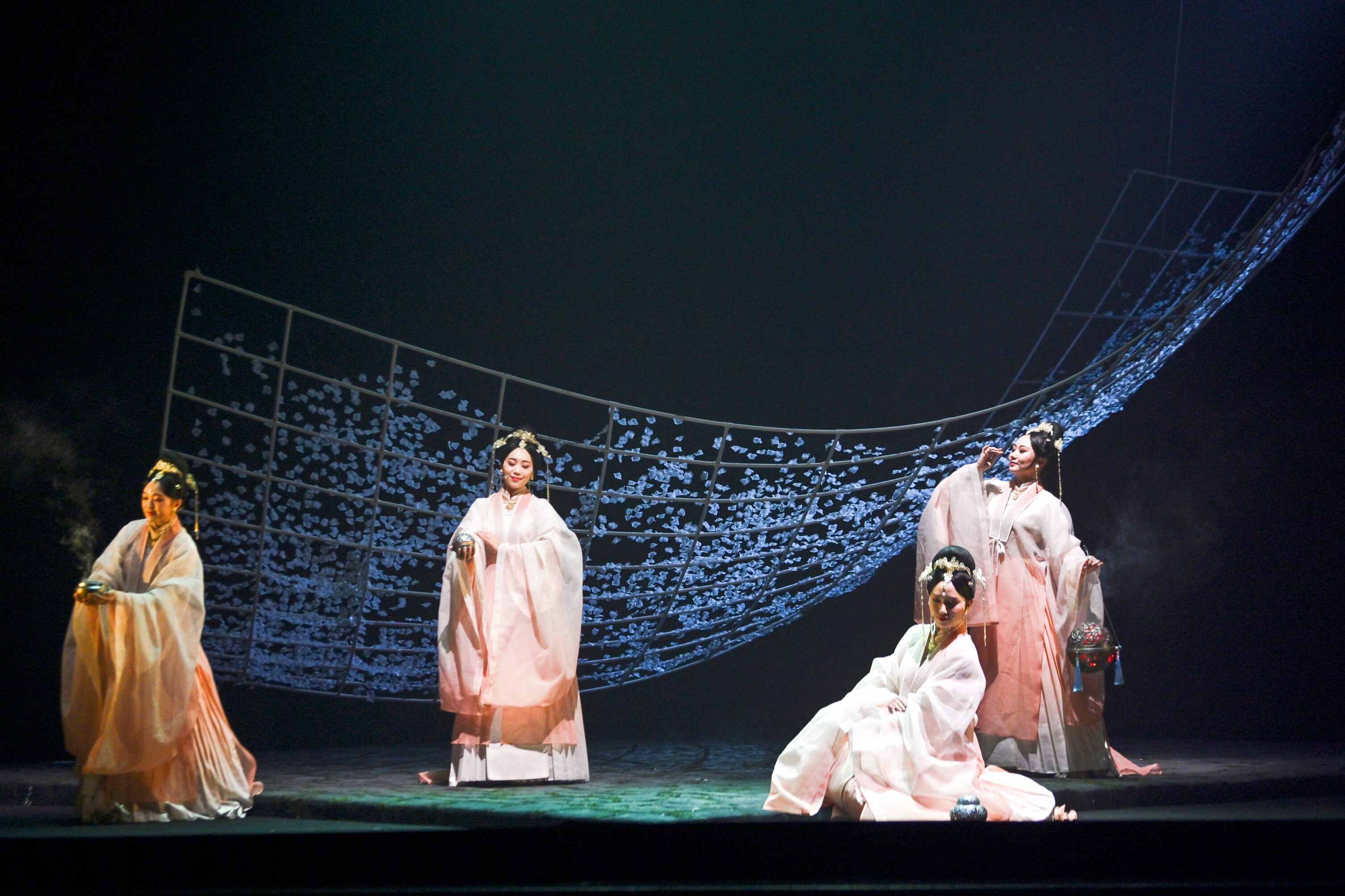 灯光射向剧场的侧门,四名侍女提着香薰炉缓缓出场,拉开了新古典小剧场粤剧《帝女花·一念》演出的序幕。萦绕的香雾,精致的服饰,优雅的动作,令观众沉浸在一种独特的氛围里,静待剧情的展开……
