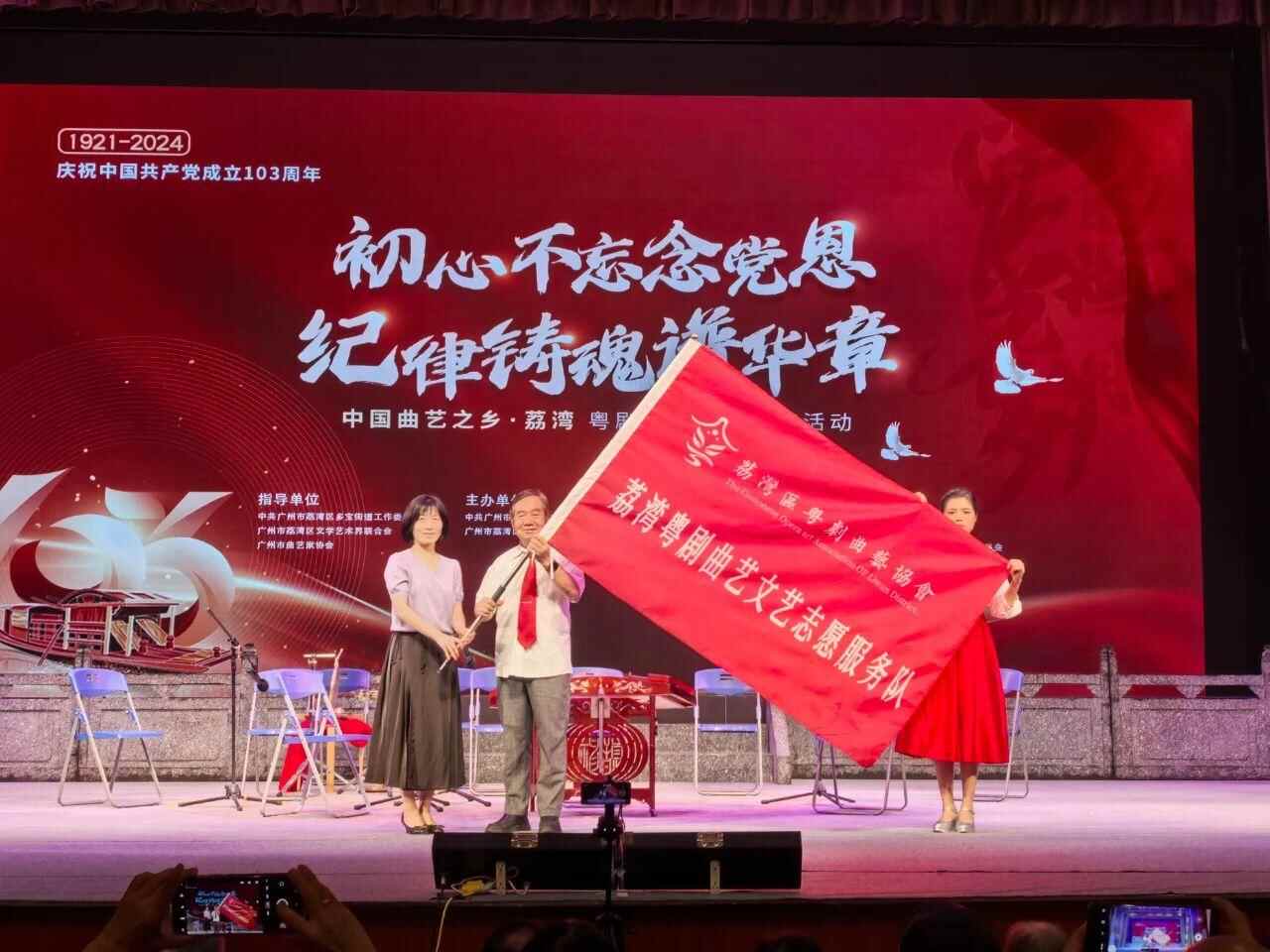 为了更好地开展文艺志愿工作,用粤剧曲艺服务人民,在本次演出开始前,荔湾区粤剧曲艺协会和永庆坊社区分别成立文艺志愿服务队,并获颁服务队旗帜。