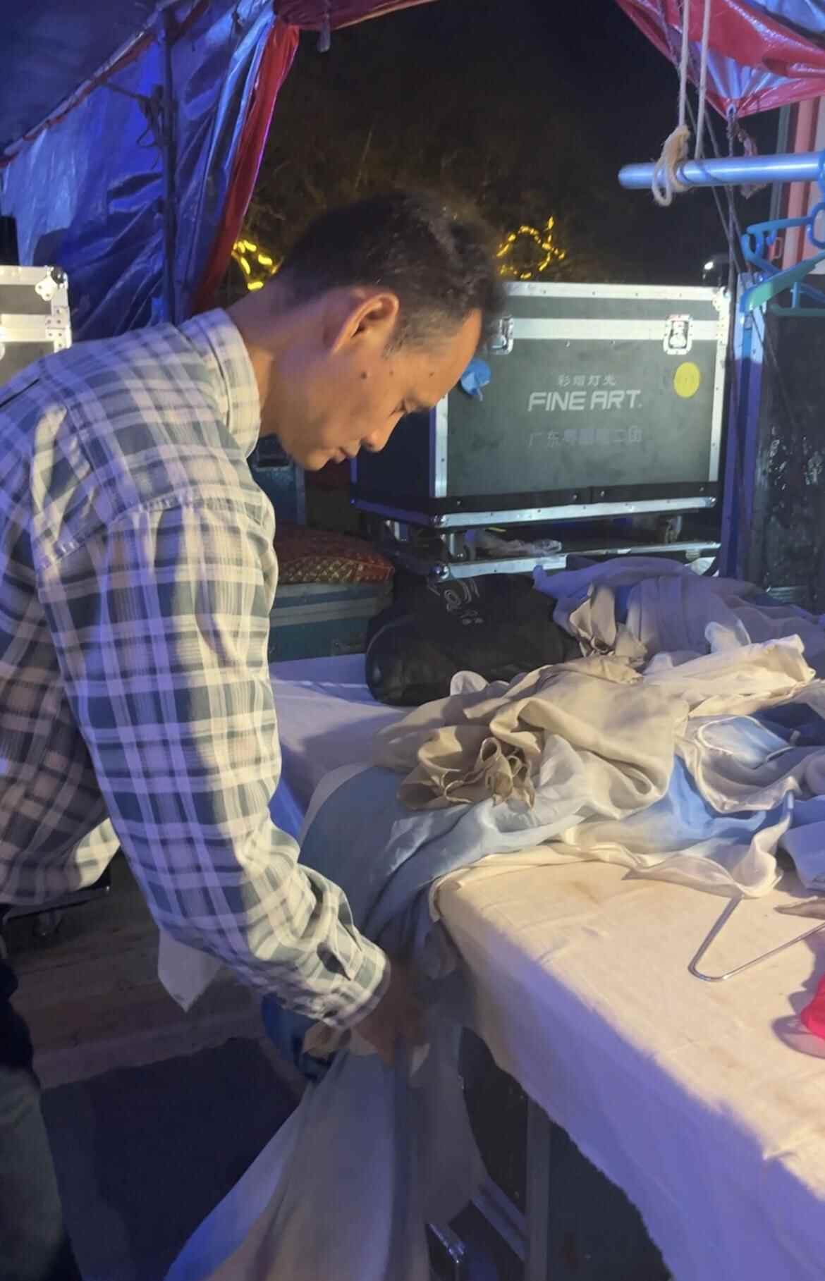 从下午5点多演员进场,直到晚上11点散场,秦志力的手脚几乎没有停过。记者好奇戏服为何需要逐一吹干,他回答道,戏服不能洗,水洗会冲走衣服上的浆水,使其变软、不够硬挺,也可能导致上面的绣花掉色。