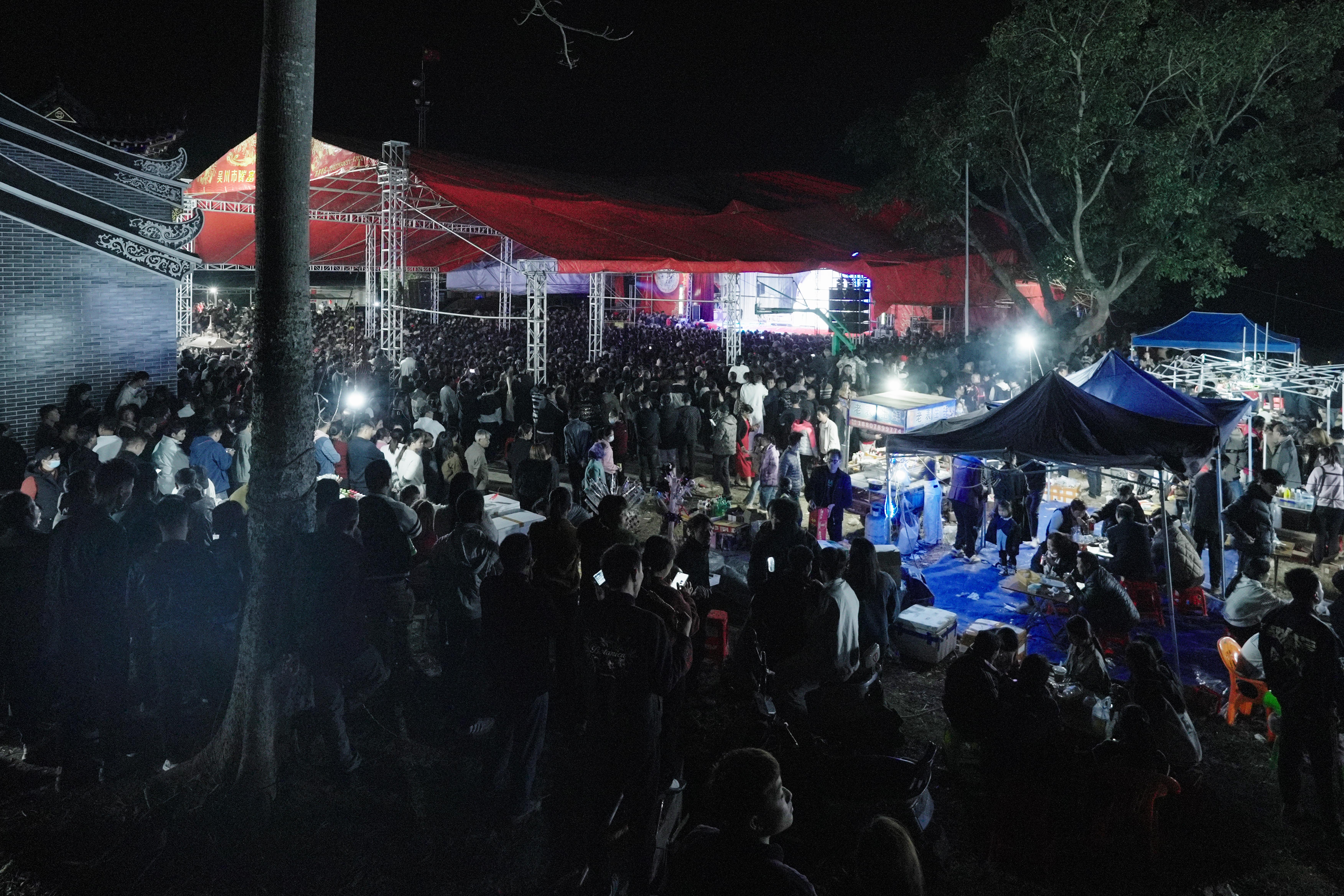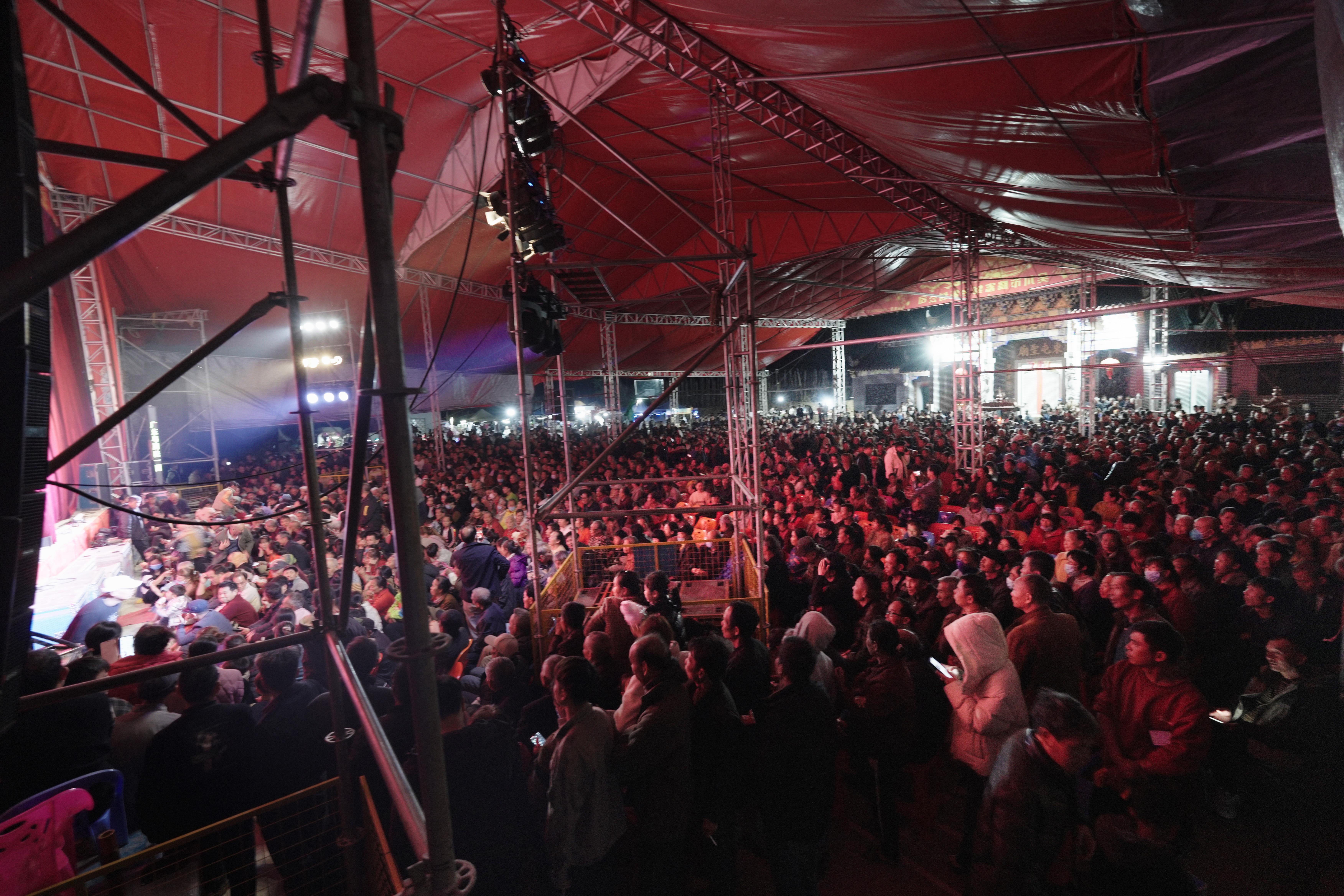 2月18日-22日,广东粤剧院一团来到广西壮族自治区北海市合浦县山口镇苏木山英罗村,展开为期五天的春班演出。首日演出的是传统例戏《六国大封相》和新编剧目《谯国夫人》,随着夜色转暗,舞台两侧“升”起黑压压的人影,远处路灯都被遮掩了。
