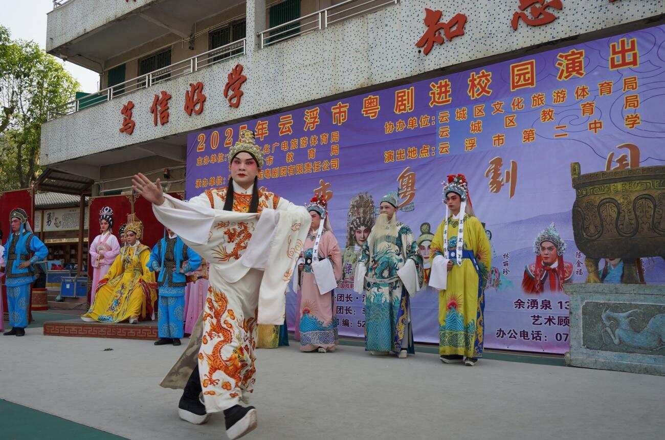 3月24日下午,云浮市第二中学操场的哨声并没有如期响起,反而在梆子和锣鼓的节奏声中,响起了琵琶、扬琴和月琴悠扬的乐韵。这是云浮市文化广电旅游体育局和教育局联合组织粤剧进农村进校园演出活动中的一场,云浮市罗定市粤剧团给师生们带来一场精彩的折子戏表演。