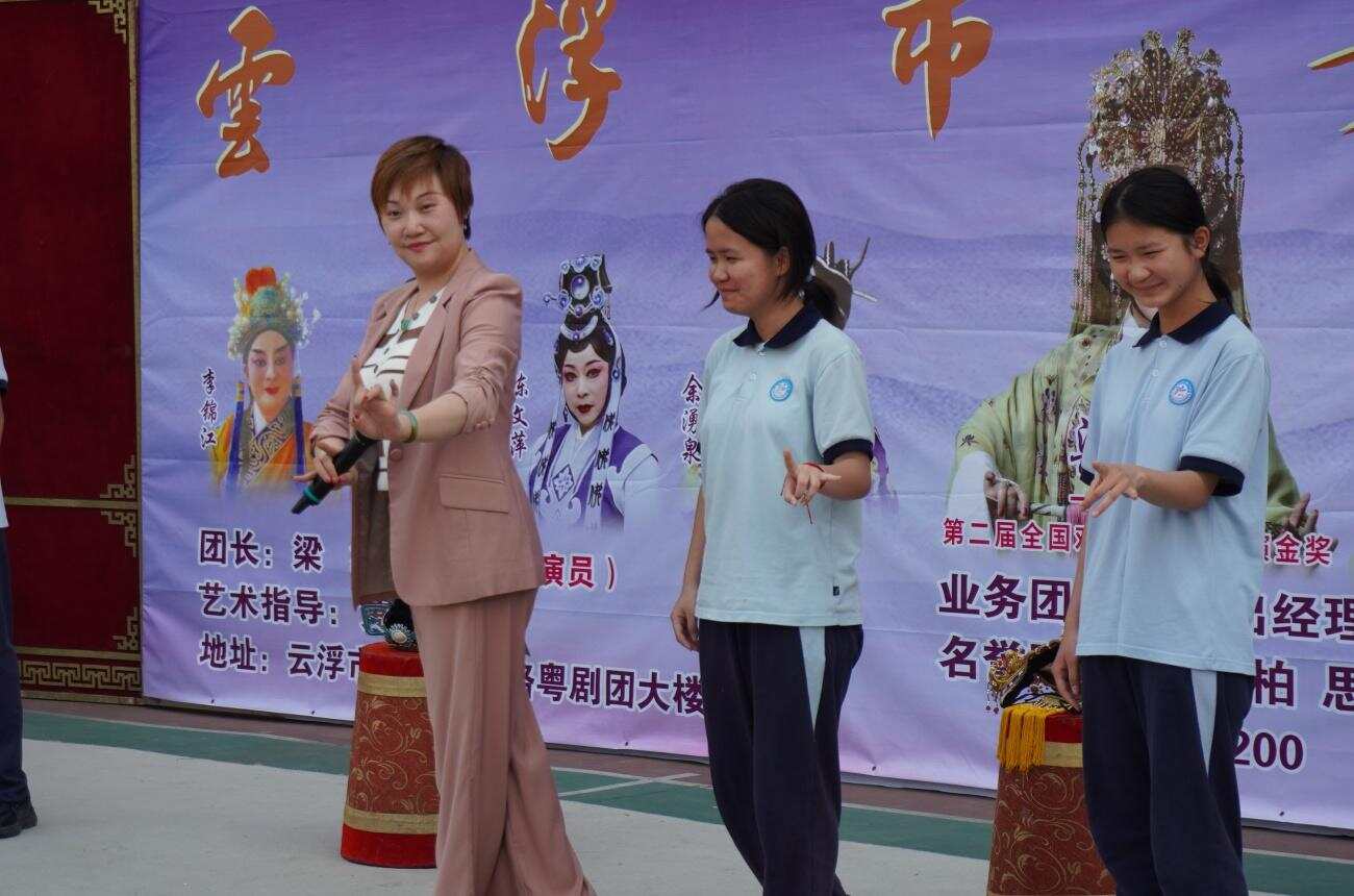 现场数百名学生围在简易的舞台前,聚精会神听戏曲粤剧知识传承讲座。剧团团长、一级演员梁钰用风趣的语言、浅显的解说,寥寥数语把粤剧的基本知识讲透,同学们听得津津有味。梁钰还请了6位同学上台,学会了简单的粤剧表演动作。这一番体验让同学们兴奋不已。随着下课的班级越来越多,围过来观看的同学围着舞台水泄不通。