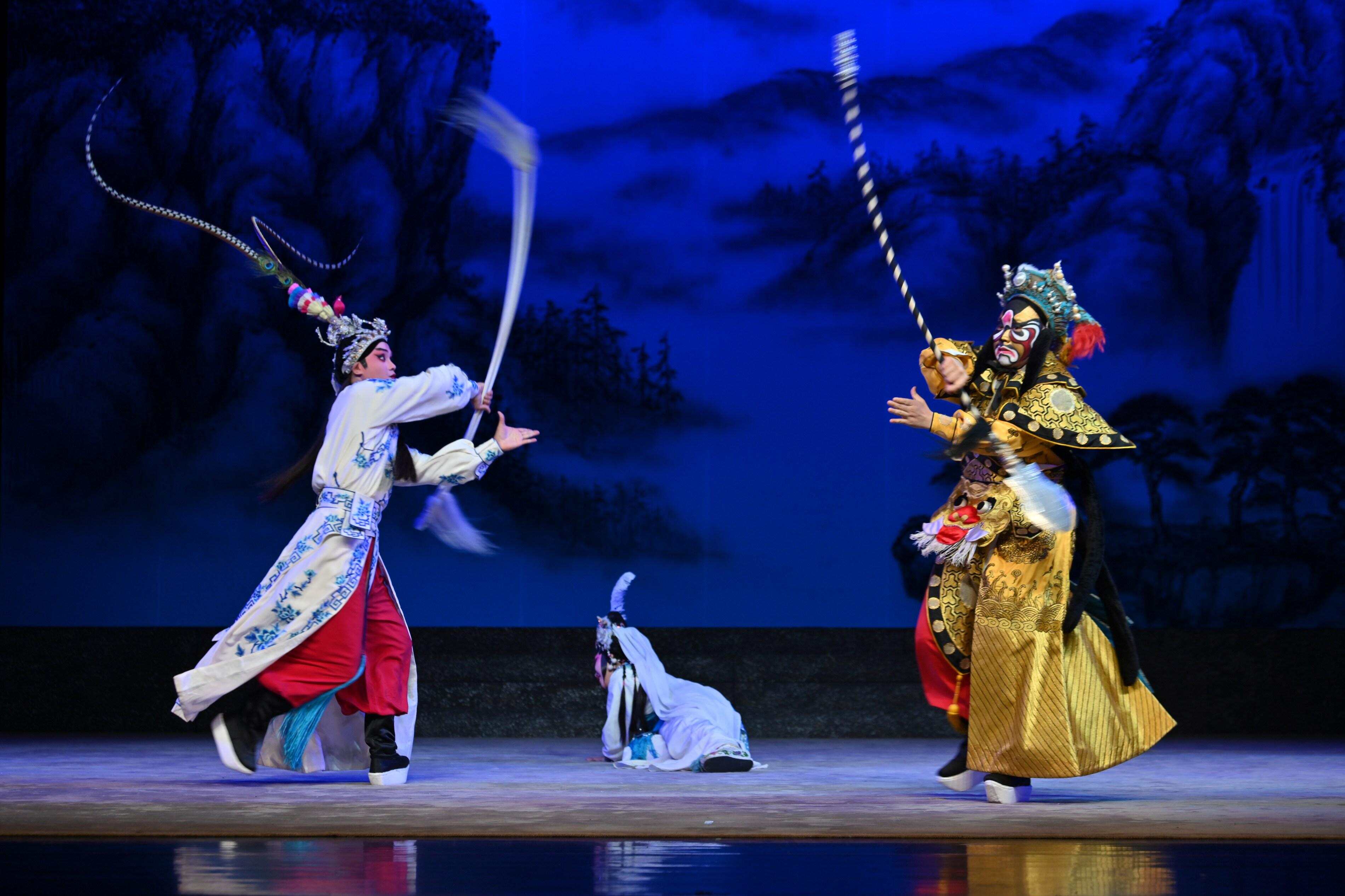 《双枪陆文龙》作为粤剧的经典剧目之一,武戏干净利落,表演勇武刚烈,气势宏大激烈,场面十分火爆。剧中既有“朱仙镇大战”的酣畅武打,又有“说书教龙”的细腻文戏,双枪武技与家国情怀交织,呈现粤剧文武双绝的魅力。