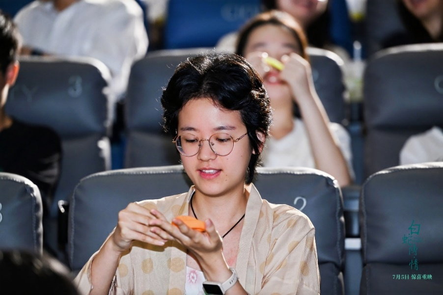 影片的发行总监刘佳笳表示,《白蛇传·情》幸运地遇到了无数与创作者心心相惜的观众。她感谢所有观众:“你们是我们创作的最大勇气和动力。”刘佳笳还现场进行了一次“观众调查”:“大家都看了几遍电影?”结果,现场有不少观众已经六刷七刷甚至八刷。而对“哪些是影迷,哪些是戏迷”的问题,不少观众则表示自己是“戏迷转影迷”或“影迷转戏迷”,再次证明了《白蛇传·情》助力粤剧艺术“出圈”的实力。