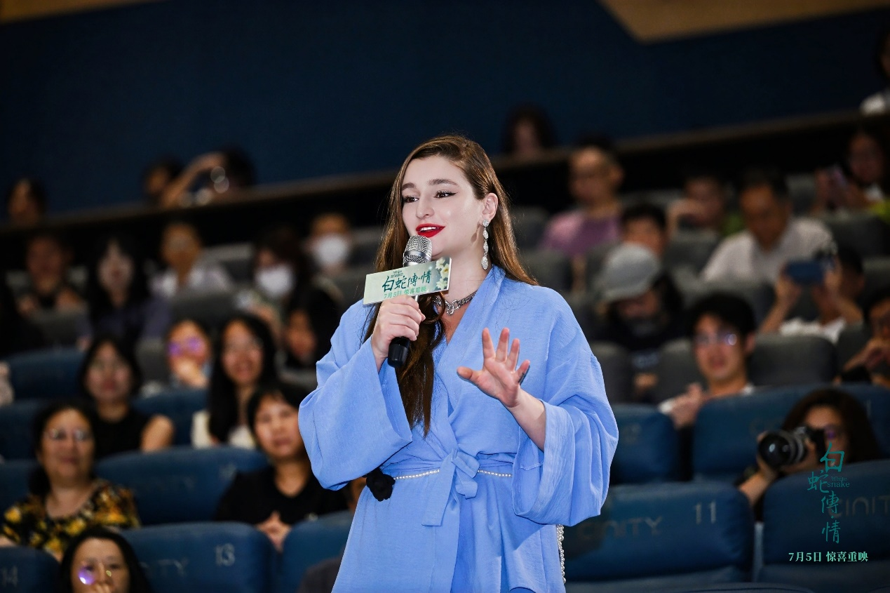 影片放映结束后,一位外国友人用中文表达了自己对电影《白蛇传·情》的喜爱。她透露,自己名叫娜娜,来自格鲁吉亚,在中国已经生活了十几年。穿着中式服装的娜娜表示,她素来喜爱中国传统文化,这次经朋友介绍来看这部“特别好看的粤剧电影”。她说,看完电影后的最大感觉是“看不够”,“我肯定还会再看一次,而且要带很多朋友来看”。娜娜还提出现场向曾小敏“学两句”,曾小敏毫不犹豫地起身,清唱起了片中唱段《趁好天时》。学完两句后,娜娜忍不住用不熟练的粤语给曾小敏点赞:“我喜欢你!”